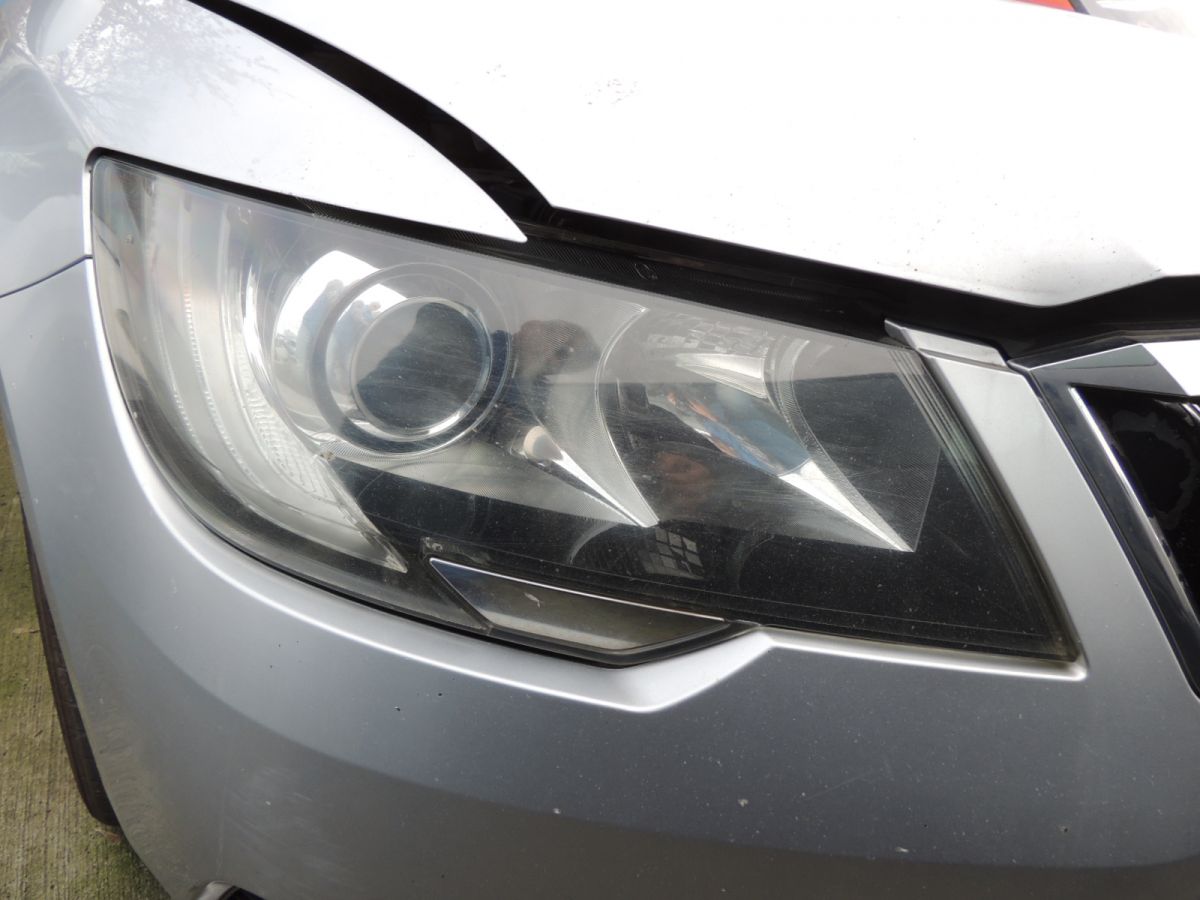 Reflektor w wersji angielskiej, soczewkowy, pochodzi z samochodu Skoda SuperB II z 2013 r po lifcie. Wersja sedan. Silnik 2.0 TDi 140 KM CFF. Model produkowany w latach 2013 do 2015.